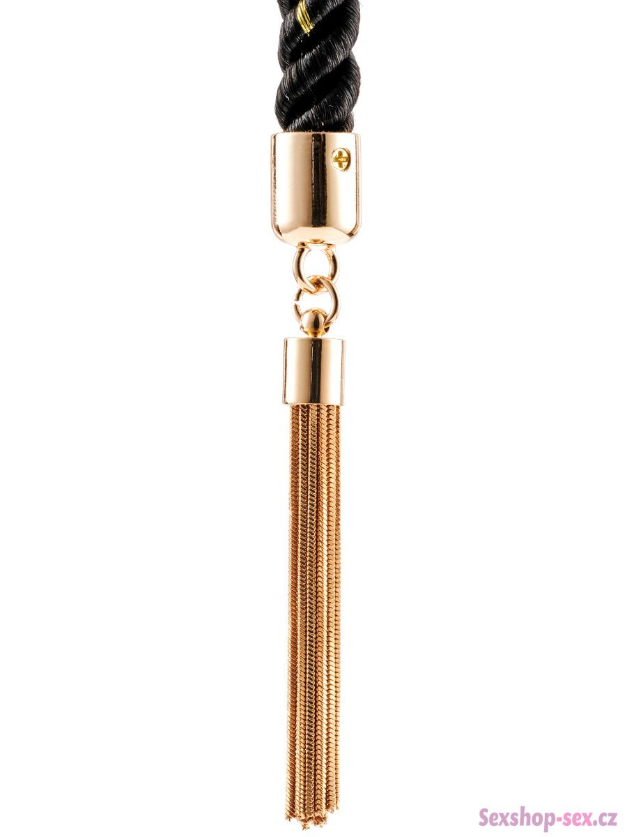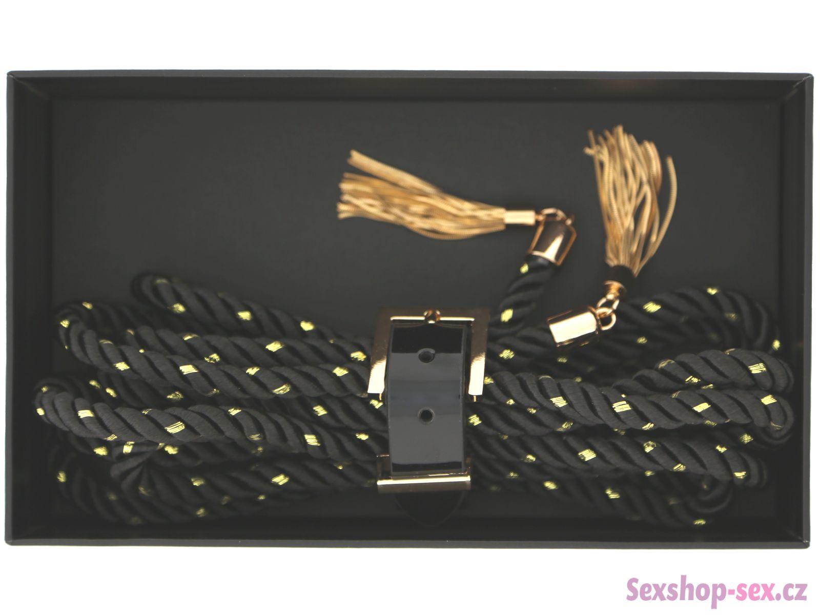 Lano má konce ozdobené zlatými střapci a dostanete k němu i řemínek s přezkou pro snadné uložení. Je měkké, pružné a příjemné na dotek – hodí se i na delší hry.