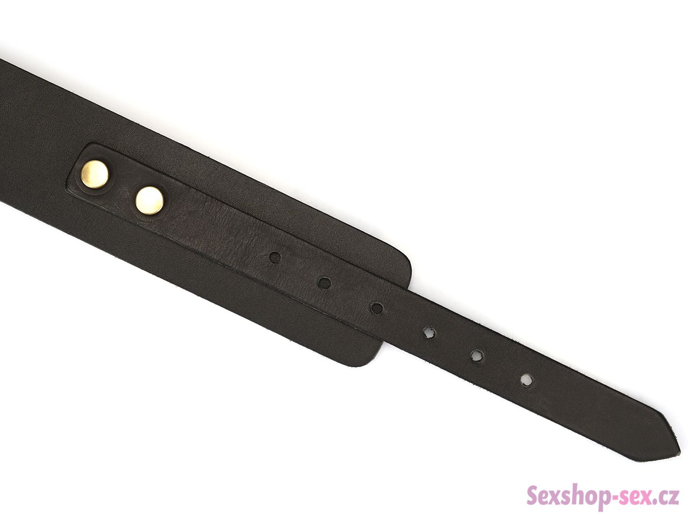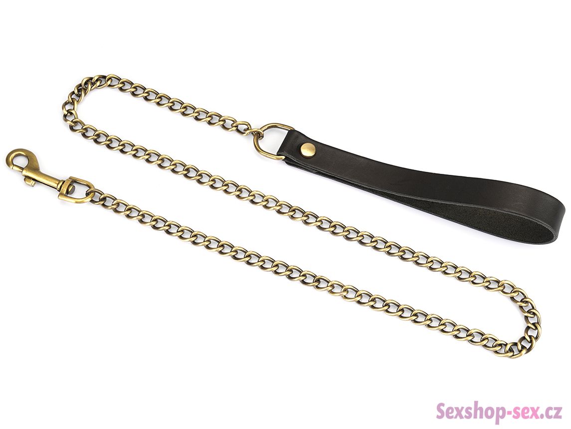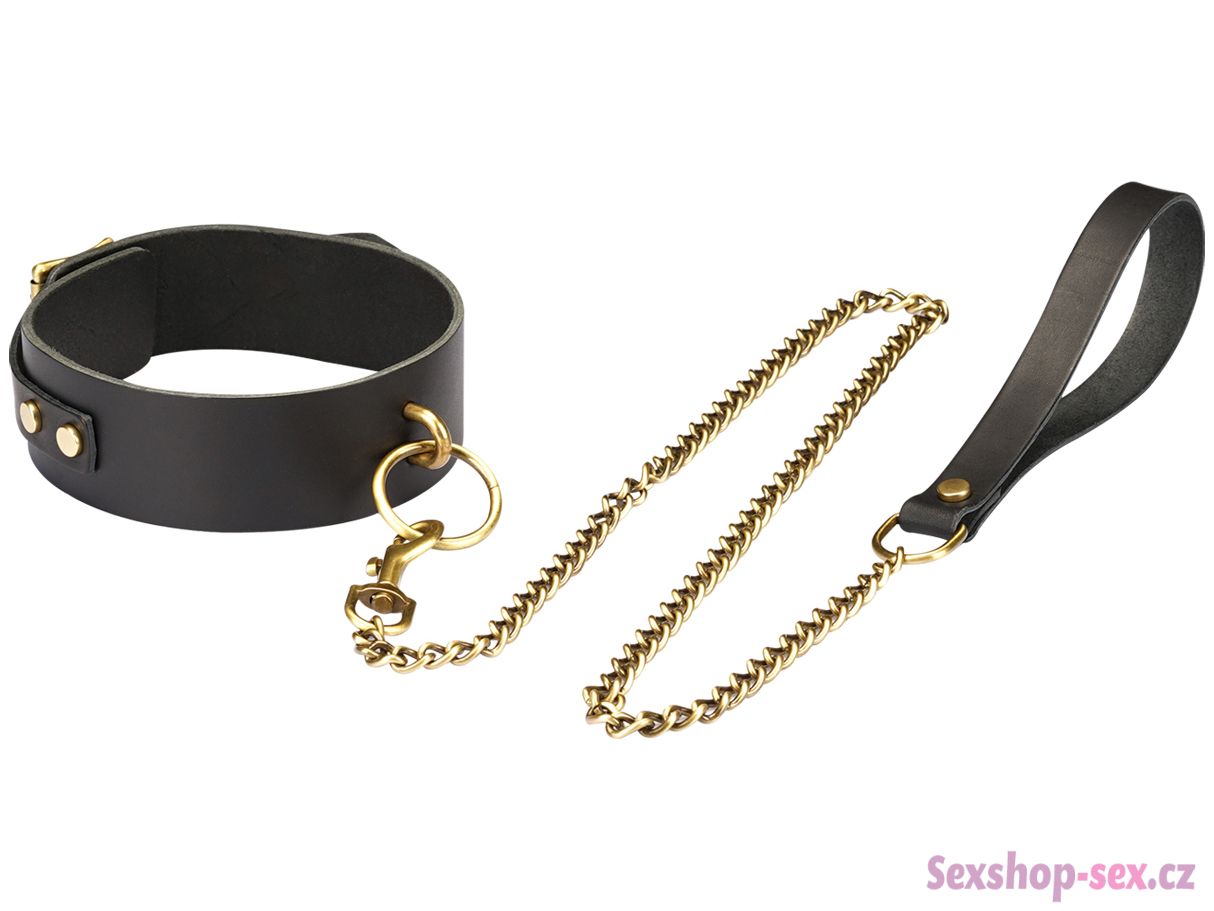 Obojek je vyrobený z tlusté hovězí kůže – je pevný a odolný a hodí se i na drsnější BDSM hry. Vodítko s kovovým řetízkem k obojku připnete pomocí karabinky.