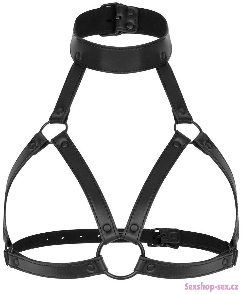 Postroj je vyrobený z umělé kůže a kovových kroužků a cvočků. Krásně orámuje ňadra a můžete ho nosit na holém těle i oblečení.