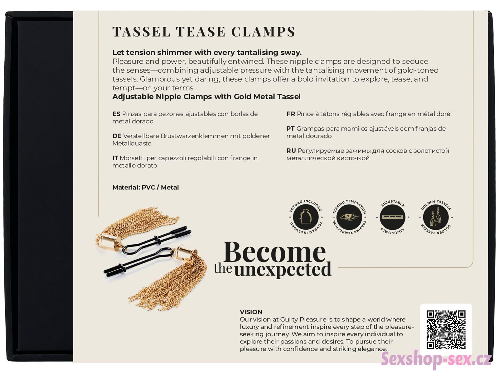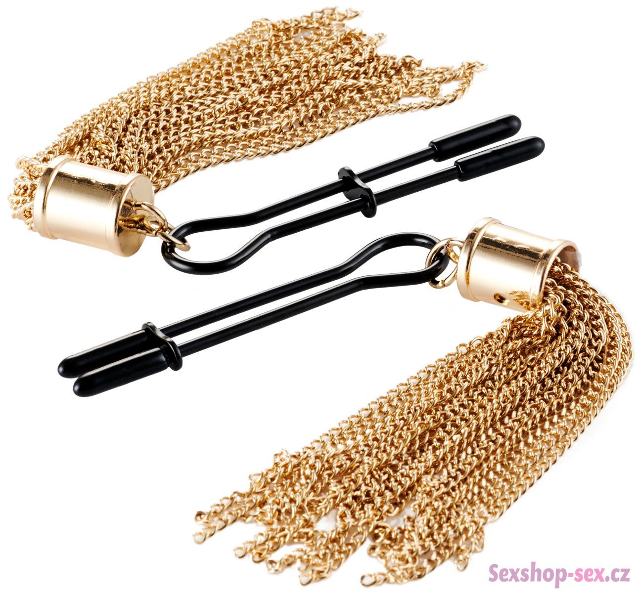 Svorky mají nastavitelnou sílu stisku a jsou ozdobené střapci ze zlatých řetízků – poslouží nejen k BDSM hrám, ale i ozdobení ňader.