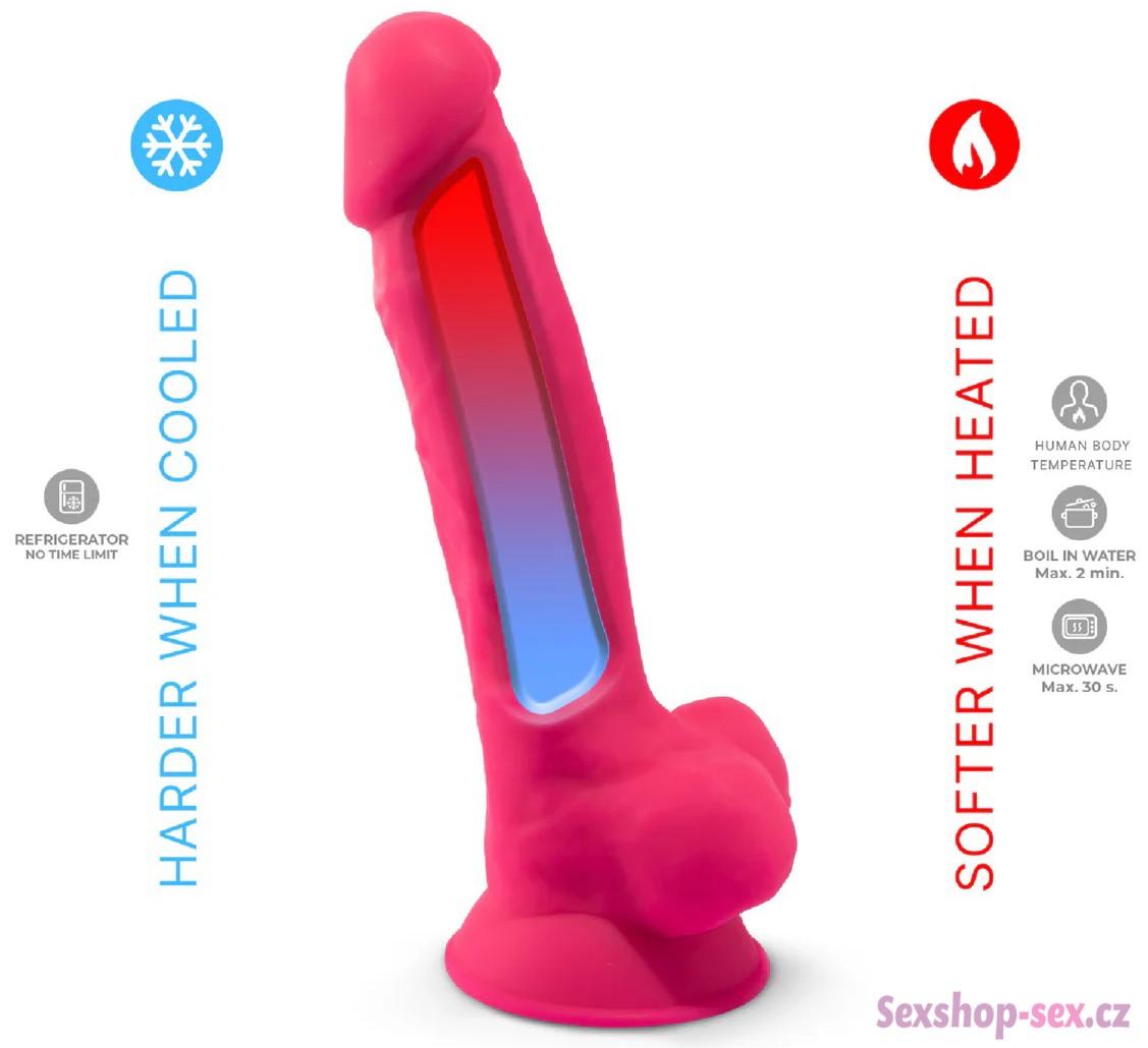 Když budete mít chuť na tvrdší hrátky, dejte ho na chvíli do mrazáku - dildo ztuhne. Pro změnu na měkouše ho stačí 30 sekund ohřát v mikrovlnce nebo 2 minuty v horké vodě - dildo změkne. Jen opatrně, abyste se nespálili.