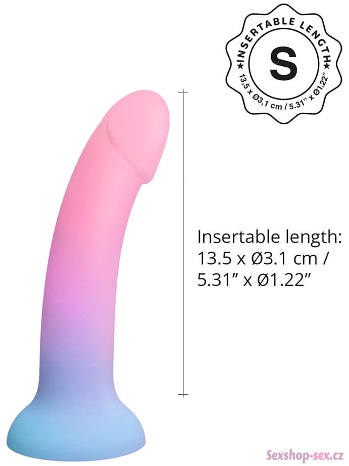 - Rozměry: celková délka 15,3 cm (včetně přísavky), zasunutelná délka 13,5 cm, max. průměr 3,1 cm