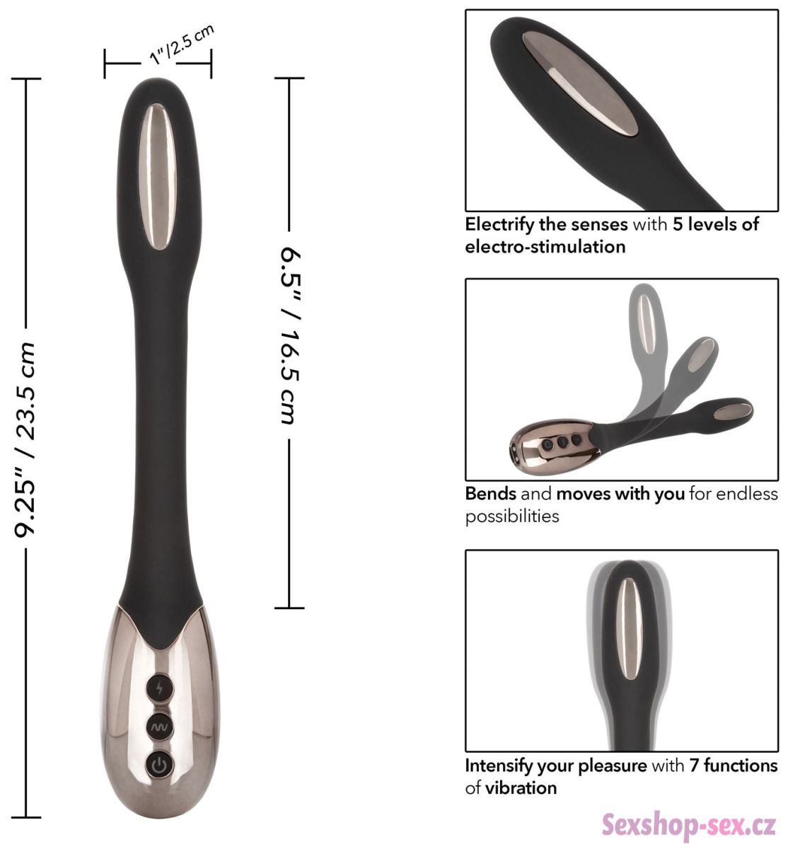 Ohebné tělo vibrátoru se krásně přizpůsobí křivkám vaší vaginy. Jakmile do vás zapluje, postará se o vaše potěšení 7 vibračními programy a 5 intenzitami elektrostimulace (od něžného brnění až po silné výboje).