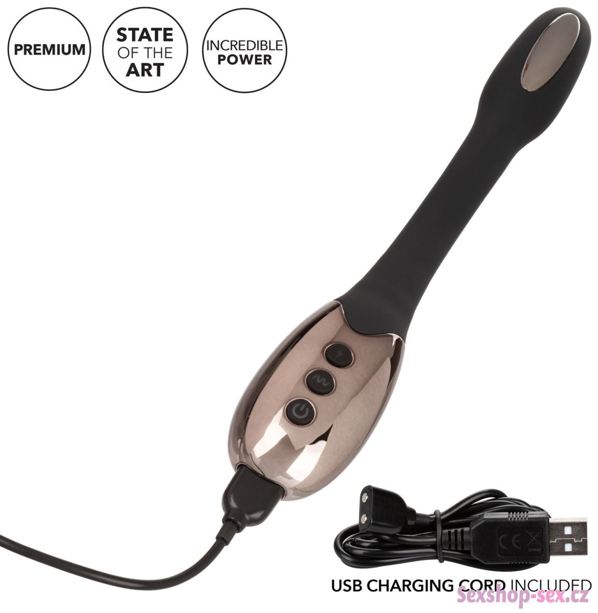 Vibrace jsou soustředěné do špičky vibrátoru a stříbrné plošky ze slitiny zinku fungují jako elektrody (pro elektrostimulaci je potřeba se dotknout obou dvou zároveň) - není potřeba žádný elektrostimulační zdroj ani kabely.