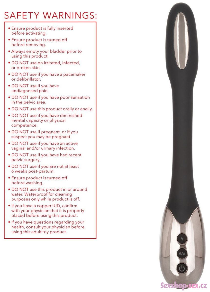 UPOZORNĚNÍ: Elektroprogramy zapněte až poté, co je pomůcka plně zasunutá do vaginy. Před vytažením elektrostimulaci vypněte. Před zapnutím elektrostimulace vyprázdněte močový měchýř. Nepoužívejte na poškozenou, infikovanou nebo podrážděnou pokožku. Nepoužívejte, pokud máte kardiostimulátor nebo defibrilátor. Přestaňte používat, pokud se objeví bolest nebo nepříjemné pocity v pánevní oblasti. Nepoužívejte pomůcku orálně nebo análně. Nepoužívejte v těhotenství nebo při podezření, že jste těhotná. Nepoužívejte, pokud máte vaginální či urinální infekci. Nepoužívejte po operaci v oblasti pánevního dna ani 6 týdnů po porodu. Ujistěte se, že před umýváním je pomůcka vypnutá. Pokud máte zavedené nitroděložní tělísko, zkonzultujte použití s lékařem a ujistěte se, že je tělísko správně umístěno. Pokud máte jakékoliv pochybnosti, zkonzultujte použití pomůcky s lékařem.