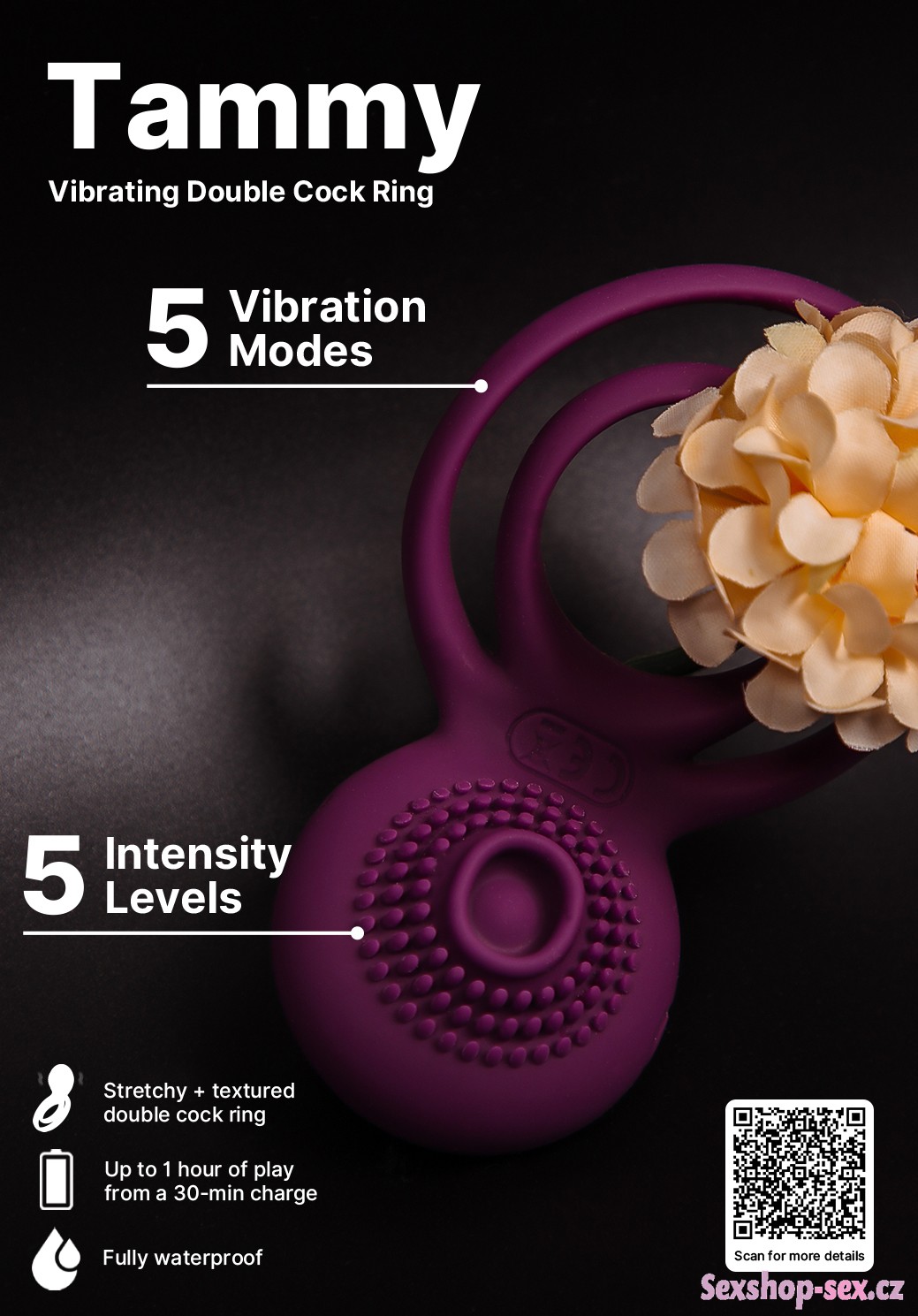 Kroužek Tammy pomůže k lepší a déletrvající erekci a zpestří sex vibracemi. Má speciální stimulační texturu pro intenzivnější potěšení klitorisu.