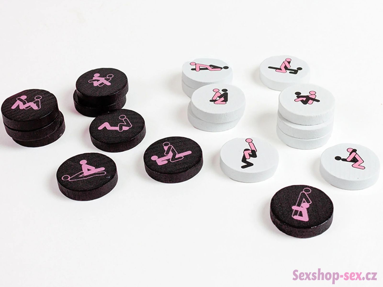 V balení najdete hrací desku a 42 žetonů (21 bílých + 21 černých) s různými pozicemi z Kámasútry.