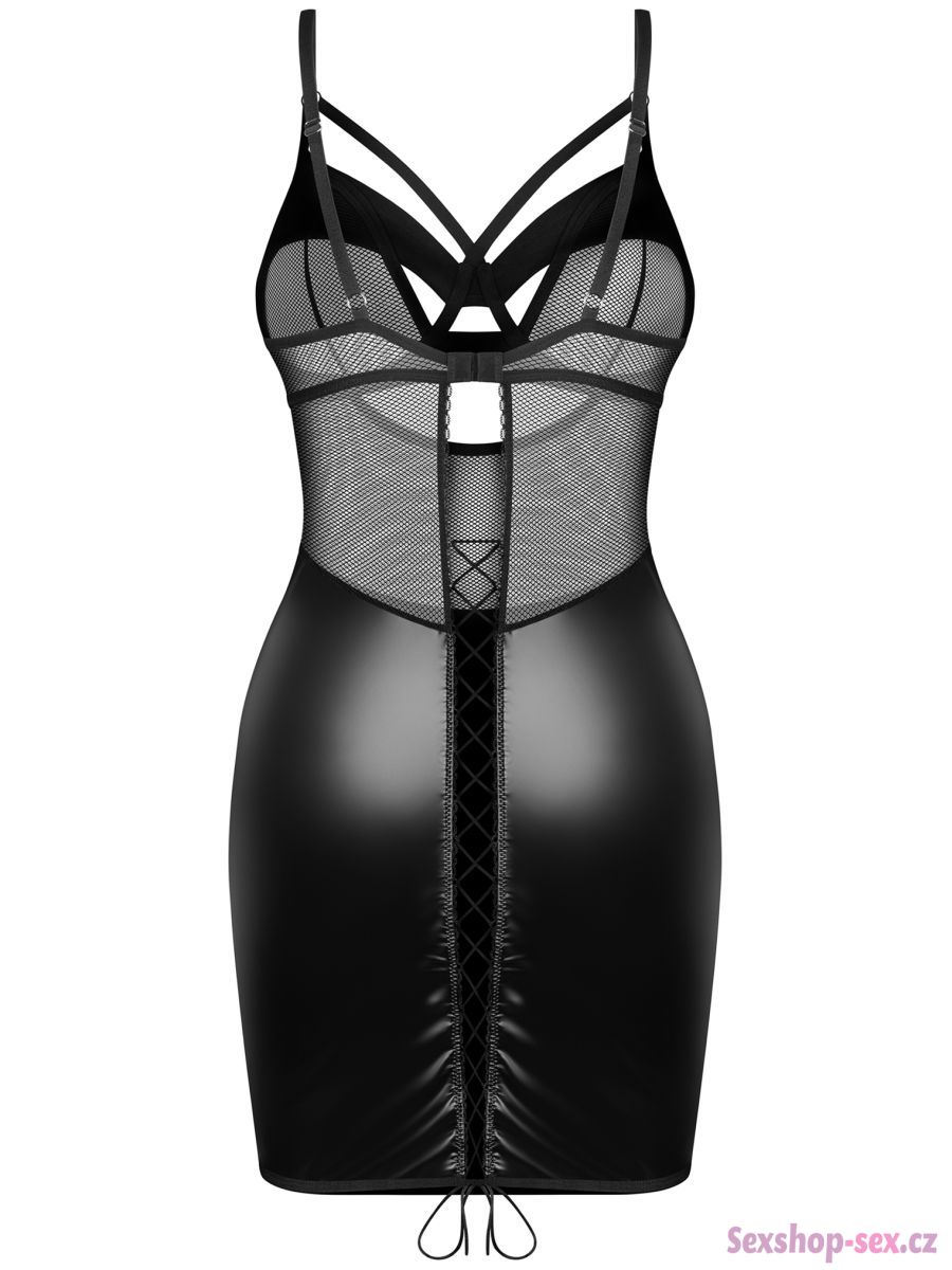 Košilka je ušitá z kombinace lesklé látky a jemné průsvitné síťoviny – oba materiály jsou měkké a elastické, takže se pohodlně nosí.