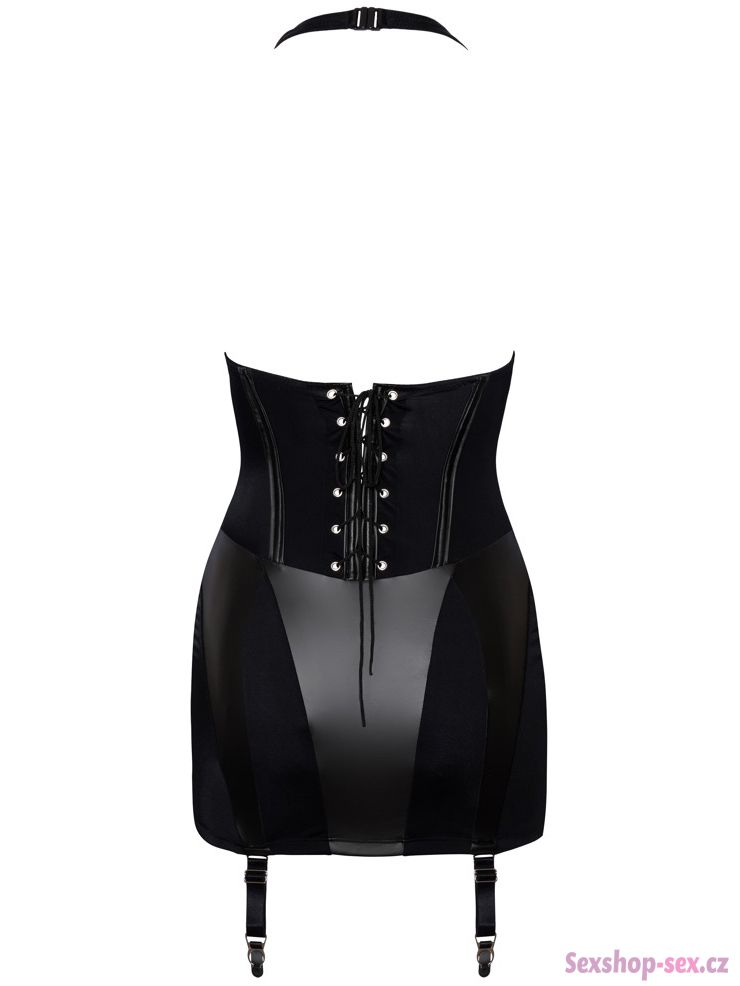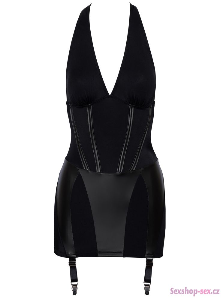 Šaty mají hluboký výstřih, zapínání za krkem, funkční šněrování v dolní části zad a 4 odnímatelné podvazkové pásky, které jsou délkově nastavitelné – snadno k nim připnete prakticky jakékoliv punčochy.