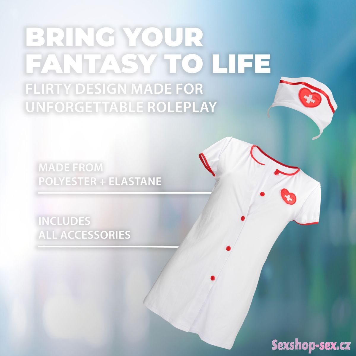 Kostým sestřičky tvoří přiléhavé minišaty, tanga a čelenka. Je ušitý z měkké a elastické látky, takže si během role play her užijete dostatek pohodlí.