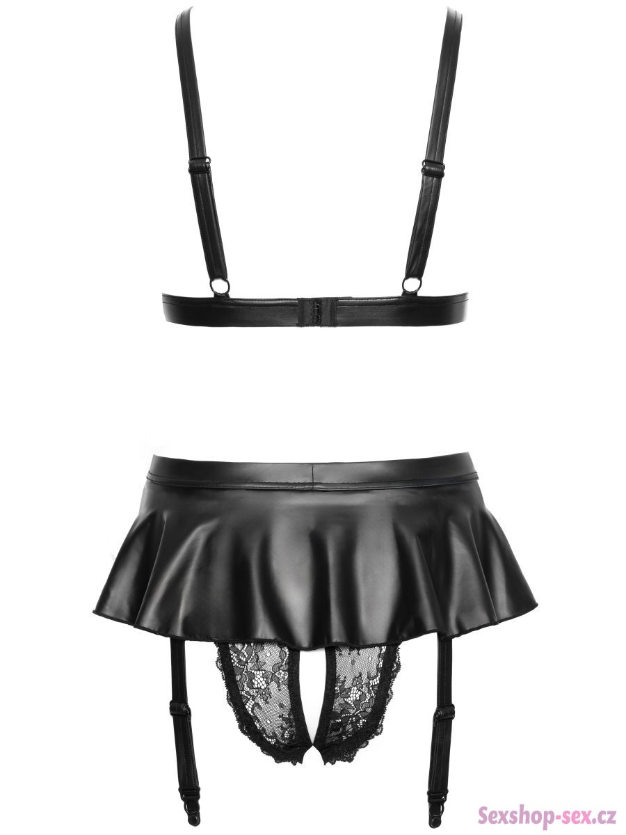 Set se skládá z podprsenky a kalhotek se sukýnkou. Je vyrobený z kombinace průsvitné krajky a wetlook látky – oba materiály jsou měkké a elastické pro pohodlné nošení.