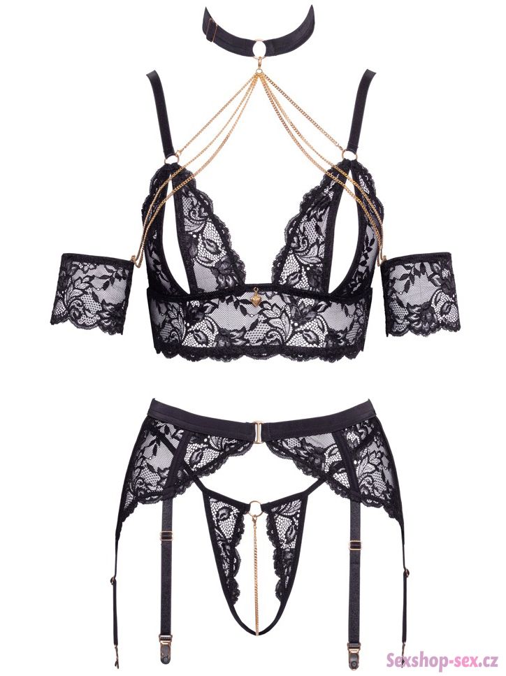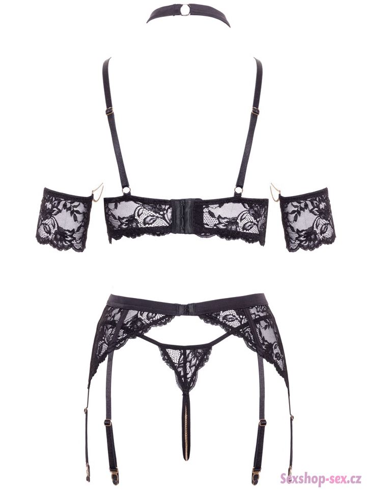 Set obsahuje podprsenkový top, podvazkový pás, tanga a ozdobný obojek. Vše je ušito z měkké a elastické krajky, která se pohodlně nosí.