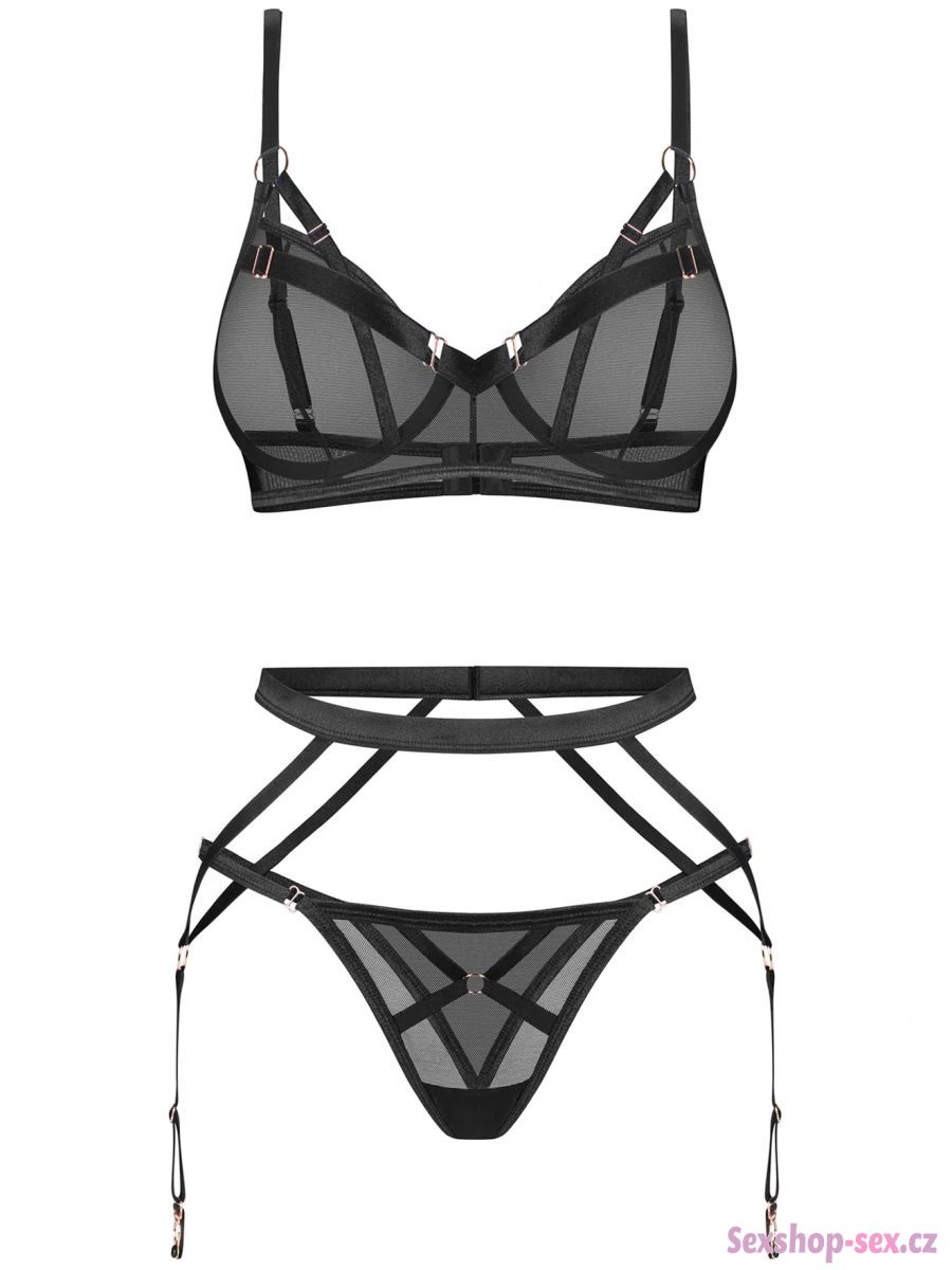 Set se skládá z podprsenky, tang a podvazkového pásu. Všechny 3 kousky prádla jsou ušity z měkké a elastické průsvitné látky, která se pohodlně nosí.