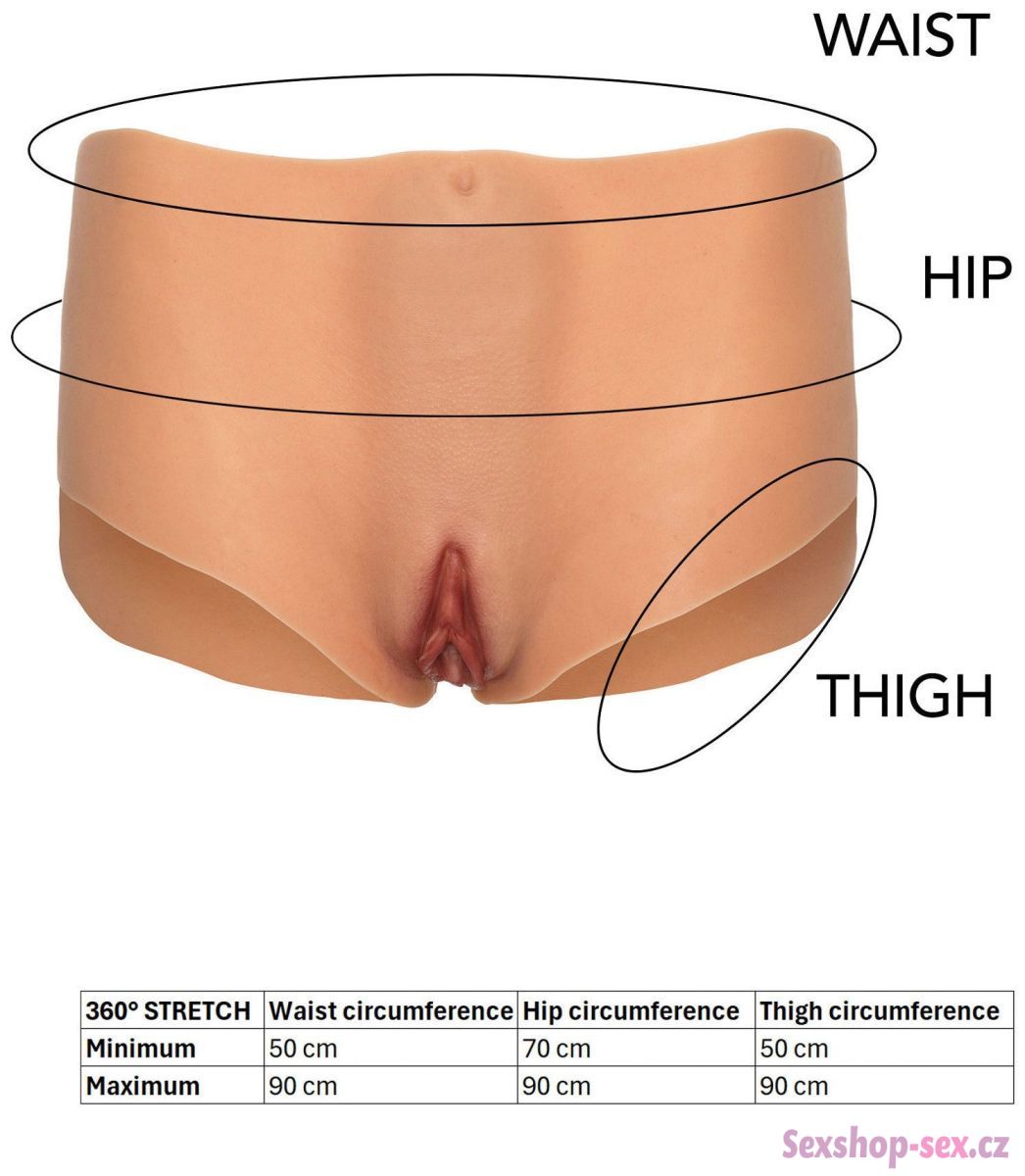 Kalhotky mají realisticky vymodelovanou vaginu se skrytým tunelem pro sex a otvor na zadní straně umožňující anální penetraci.