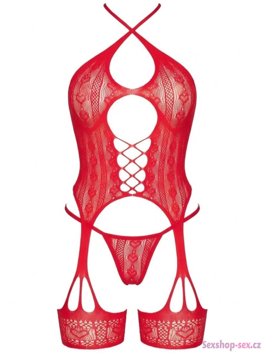 Top je ušitý z měkké a pružné síťoviny se srdíčky. Má napevno připevněné ozdobné podvazky a dostanete k němu tanga ve stejném designu.