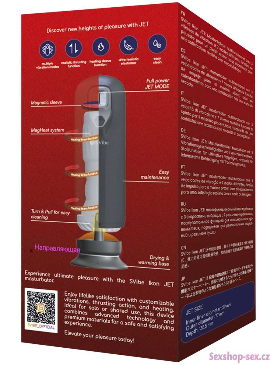 Masturbátor vás potěší kombinací intenzivních přírazů, silných a hlubokých vibrací a příjemného tepla. Navíc má speciální Jet mód – stisknutím tlačítka aktivujete maximální výkon.