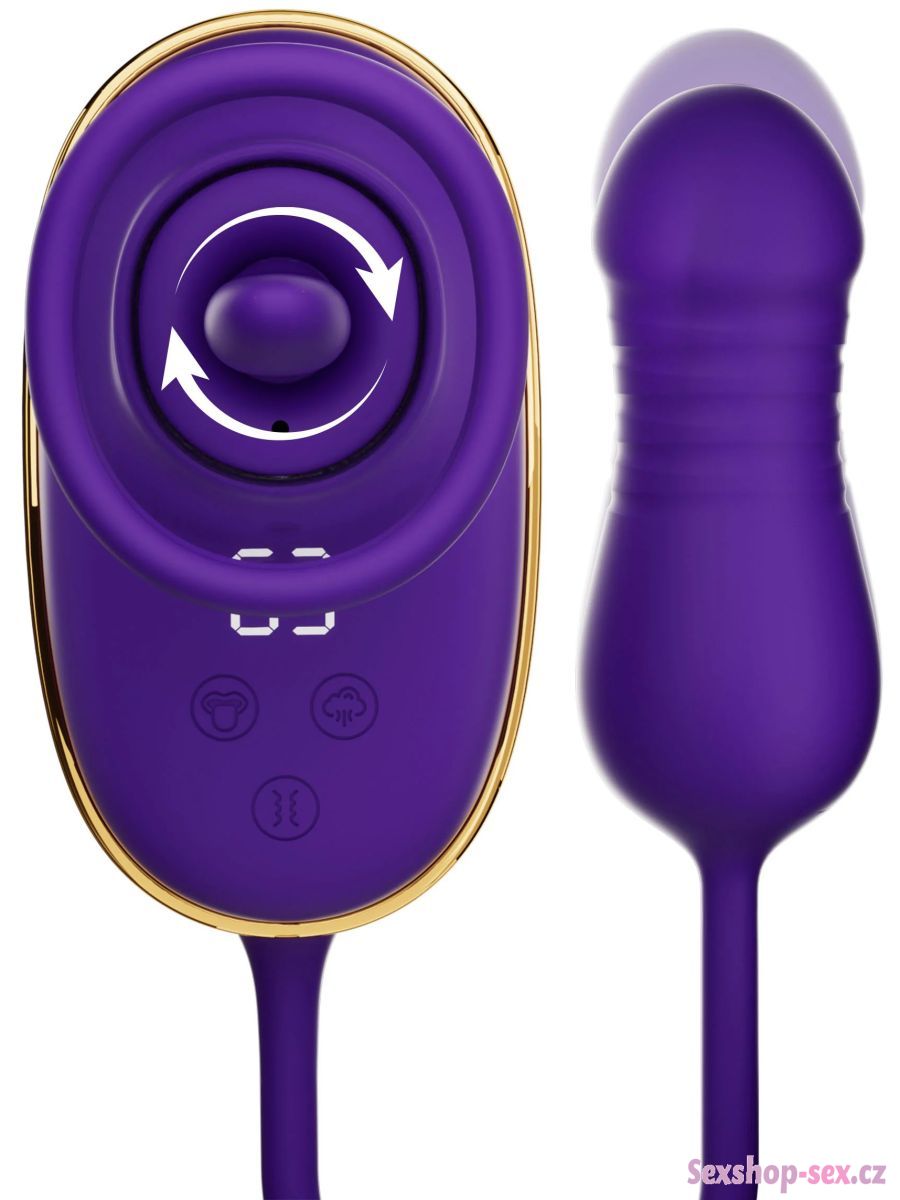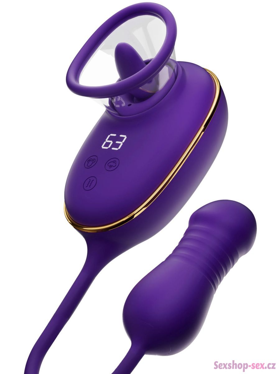 Stimulátor potěší klitoris vibracemi, sáním a rotačním jazýčkem, zatímco zadeček si užije kombinaci přírazů a vibrací.
