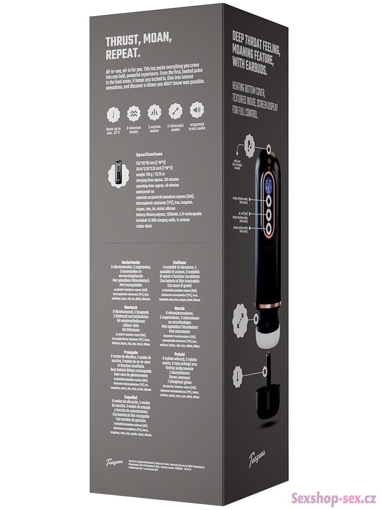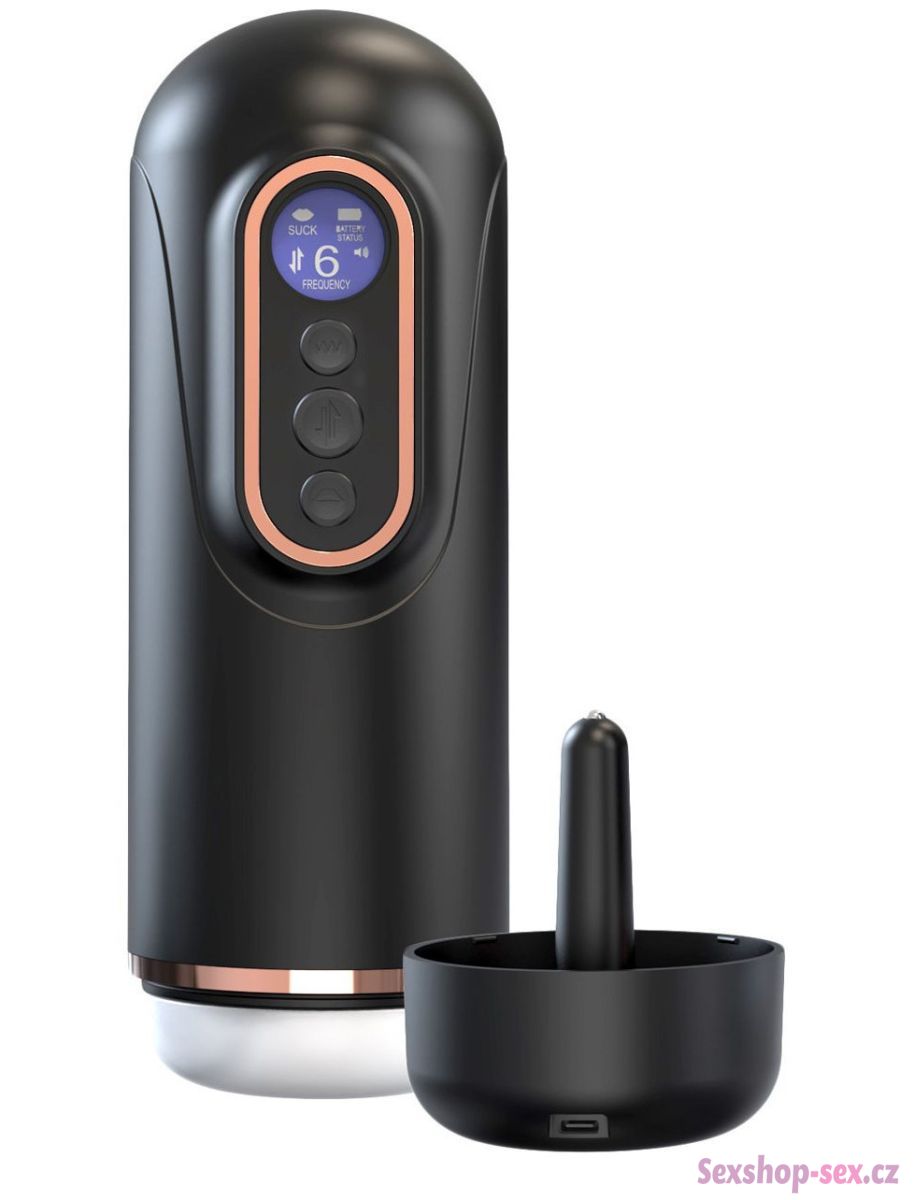 Masturbátor potěší penis multisenzorickou stimulací – kombinuje silné vibrace, přírazy a sání. Navíc lze nahřát a vydává erotické zvuky pro ještě realističtější zážitek.