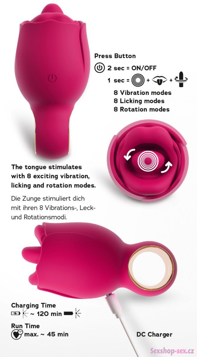 Stimulátor napodobuje orální sex pomocí rotačního a vibračního jazýčku. Celkem se můžete těšit na 8 stimulačních módů (3 intenzity + 5 vzorů).