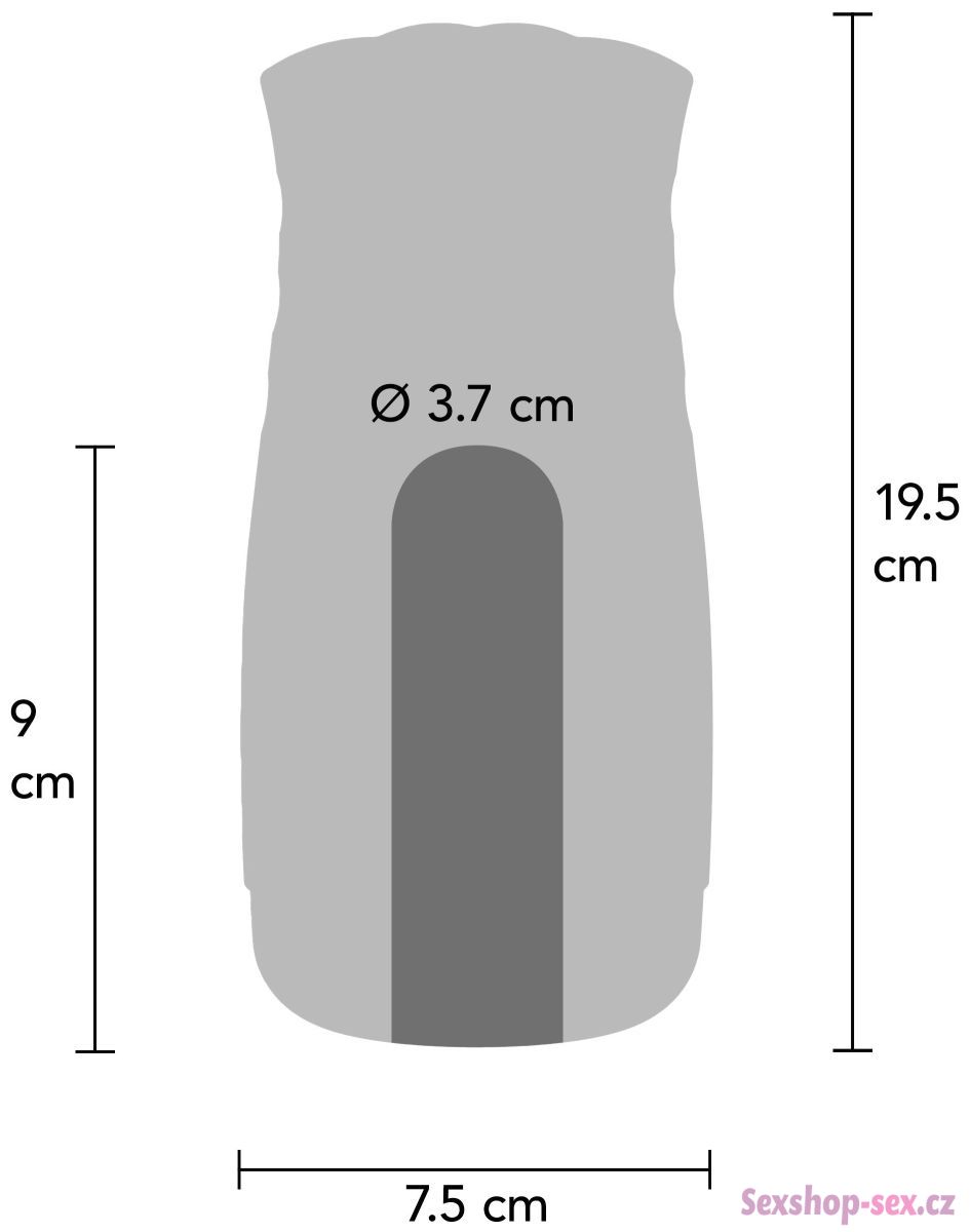 - Rozměry: celková délka 19,5 cm, vnější průměr 7,5 cm, vnitřní délka 9 cm, průměr otvoru 3,7 cm