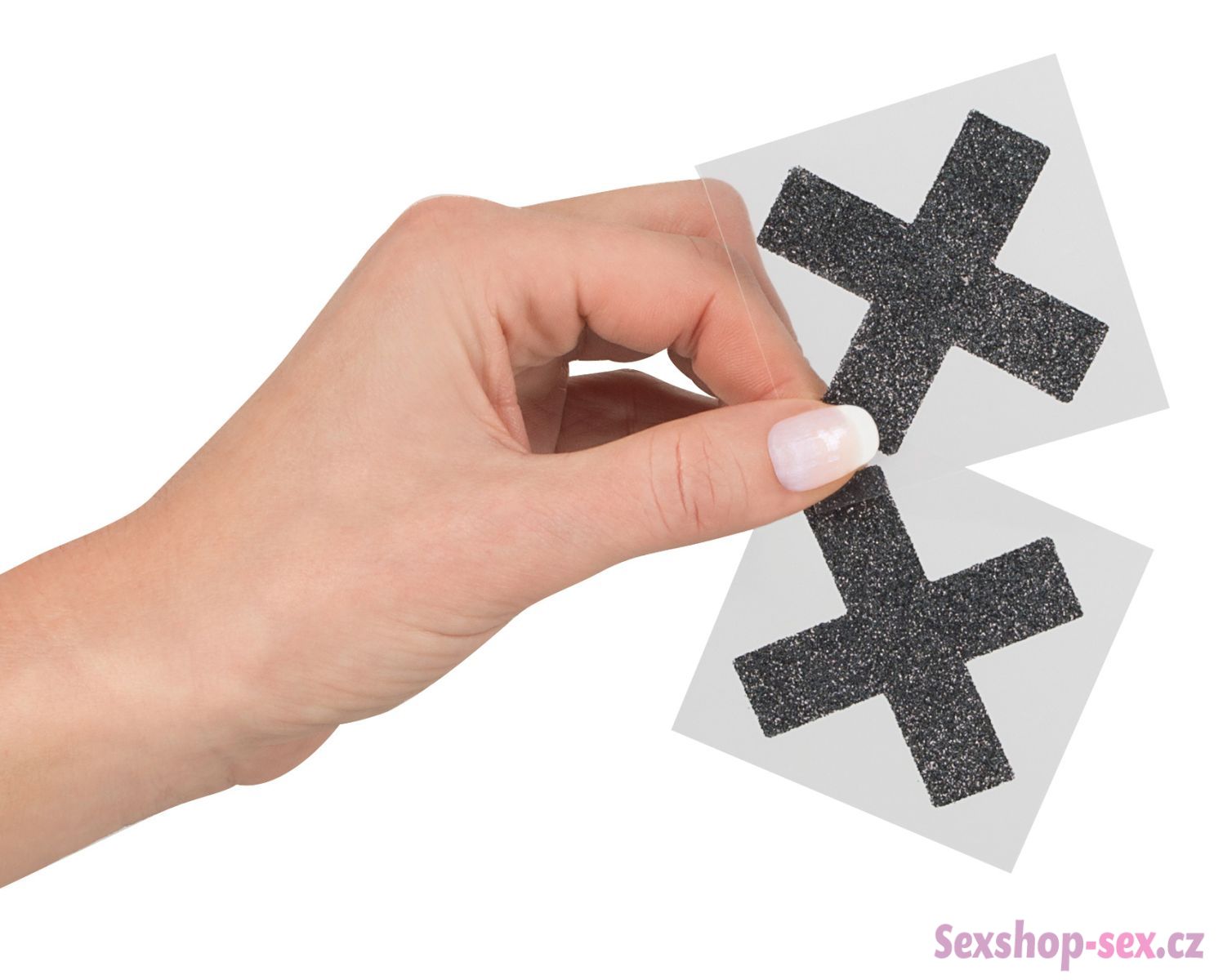 Třpytivé samolepky ve tvaru X nalepíte na prsa díky akrylátovému lepidlu, které je šetrné k lidské pokožce.