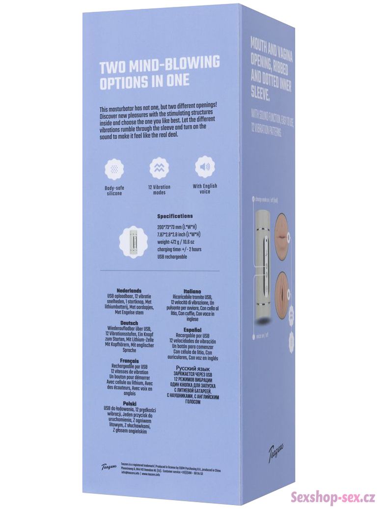 Masturbátor je oboustranný – na jedné straně má realisticky vymodelovanou vaginu, na druhé ústa. Má středně silné a hluboké vibrace a vydává zvuky.