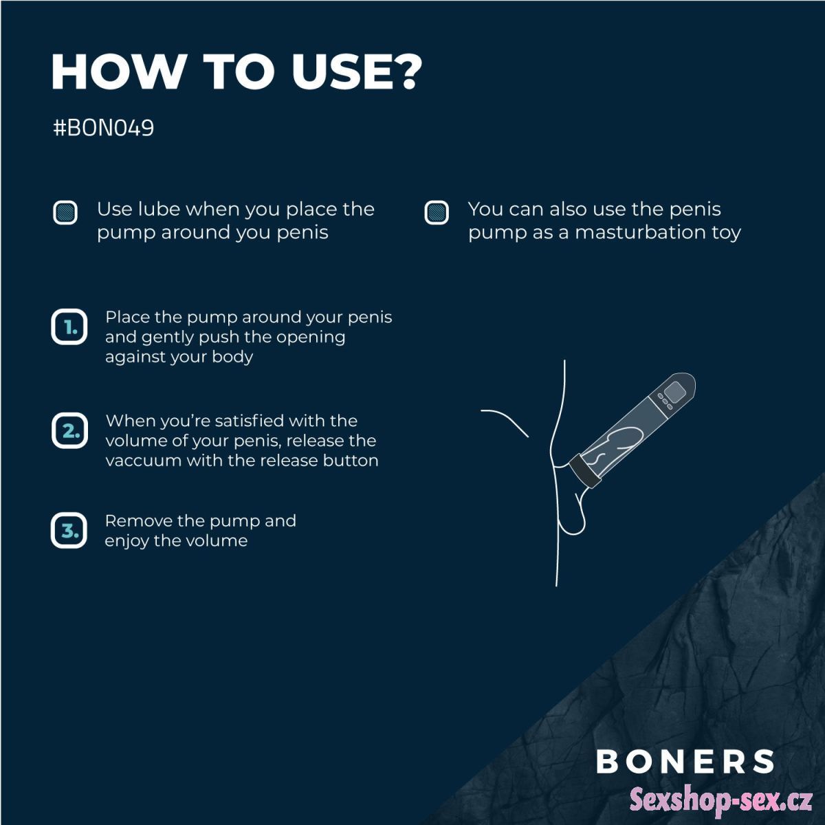 Pumpa slouží pro prokrvení penisu a zlepšení erekce. Má LCD displej a jednoduché ovládání – buď si ručně nastavíte sílu sání, nebo si vyberete z 6 přednastavených módů.