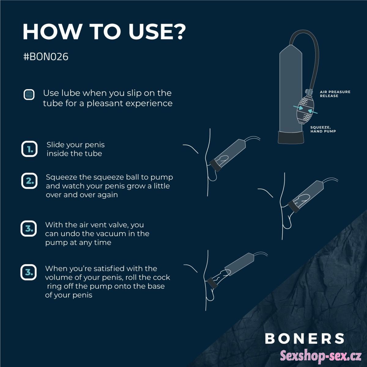 Pumpa slouží pro prokrvení penisu a zlepšení erekce pomocí silného podtlaku. Podtlak vytvoříte jednoduchým mačkáním gumového balónku.