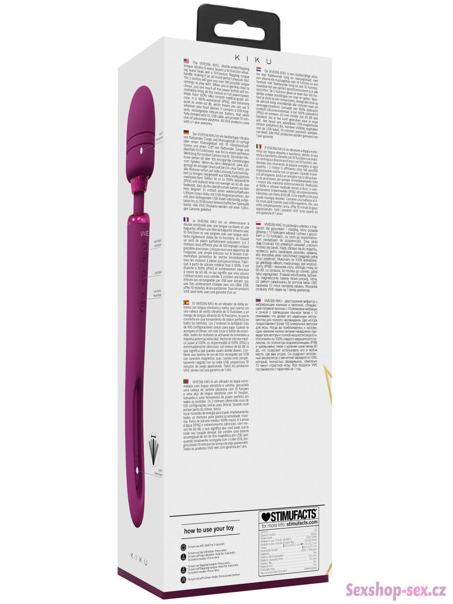 Hlavice je oboustranná – slouží pro masáže celého těla a intenzivní stimulaci intimních partií, rukojeť pak má pohyblivý jazýček pro stimulaci bodu G.