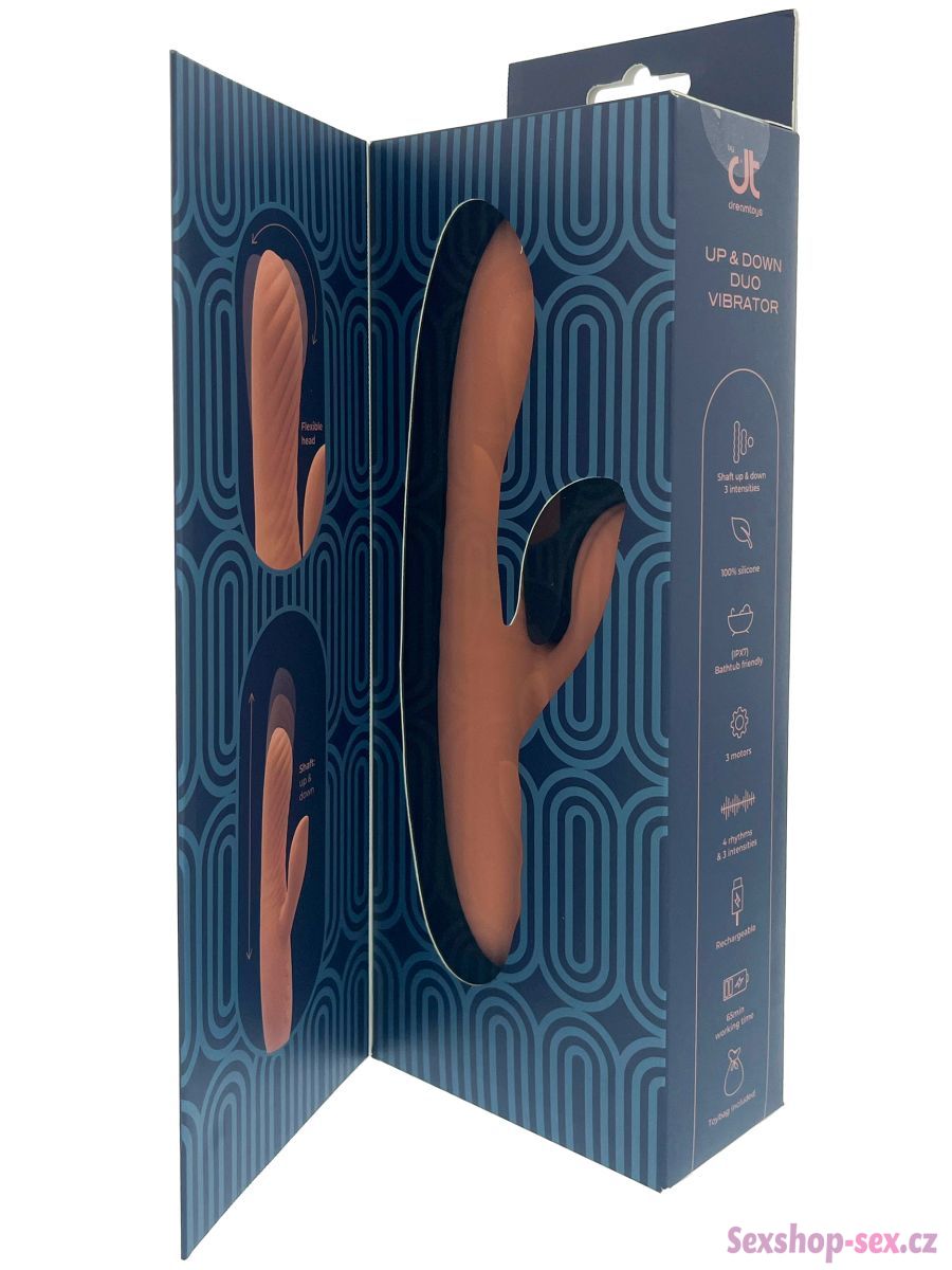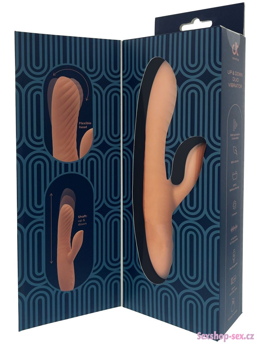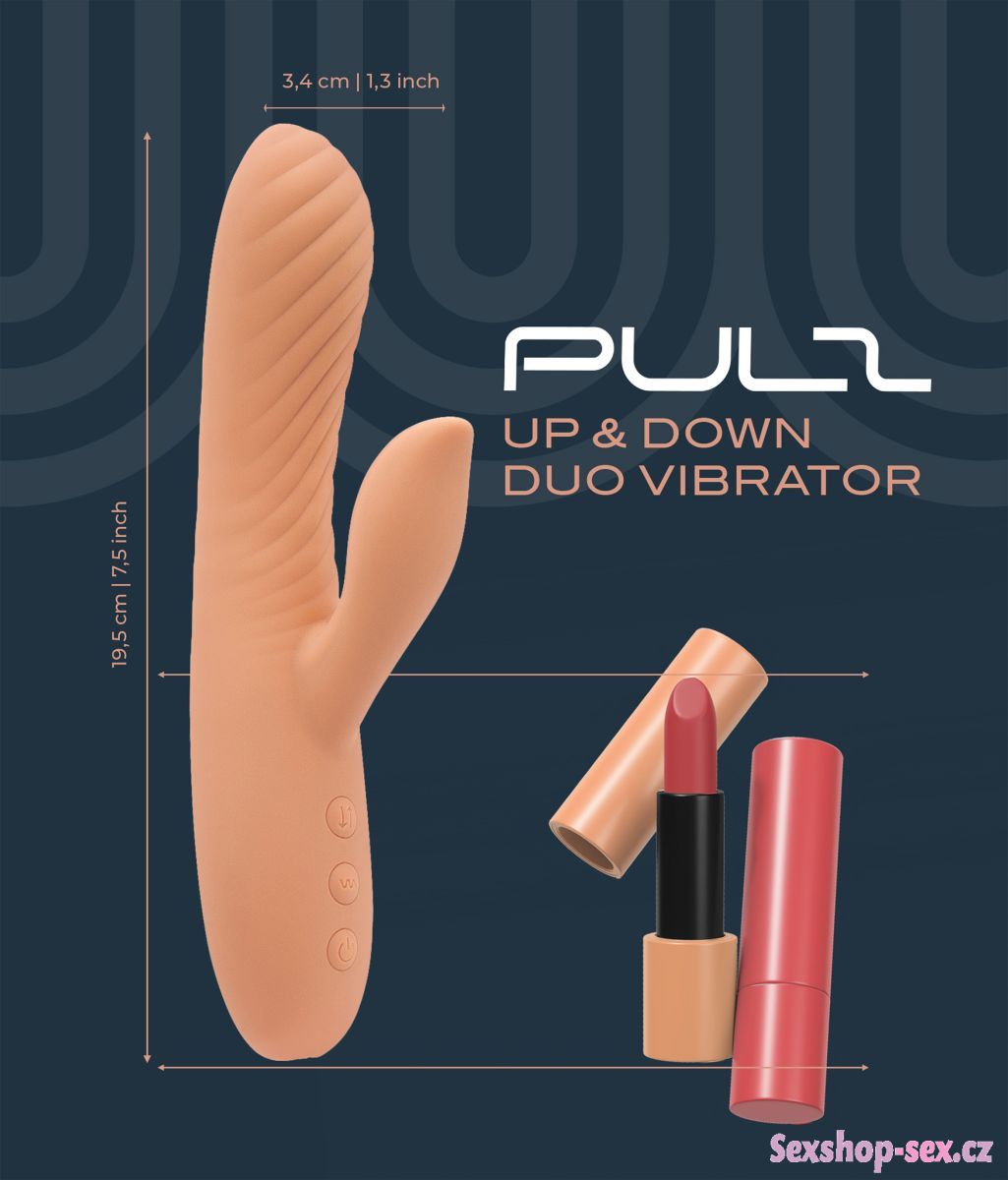 Vibrátor příjemně promasíruje bod G přírazy a silnými vibracemi, zatímco králíček se postará o vibrační potěšení klitorisu.