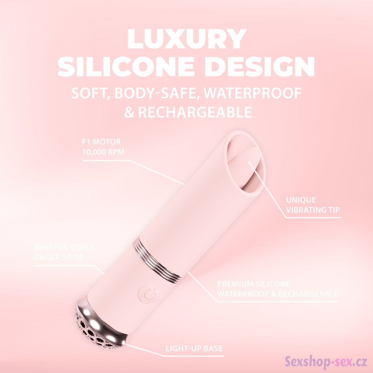 Stimulátor rozmazlí klitoris extra silnými vibracemi a jazýčkem, který imituje orální sex. Spodní část je ozdobená šperkem, pod kterým je LED indikace – mění barvu podle zapnutého programu.