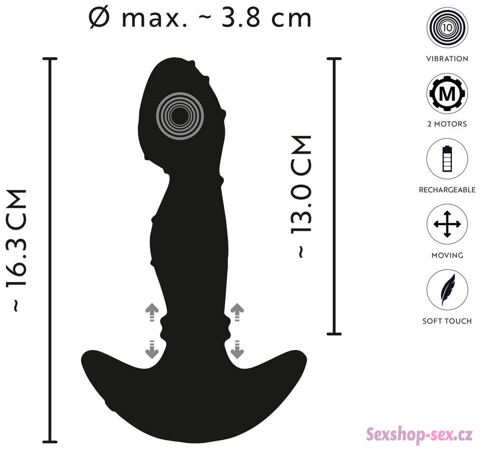 Vibrátor vás potěší kombinací silných a hlubokých vibrací a pohyblivých kroužků, které promasírují anální svěrač.