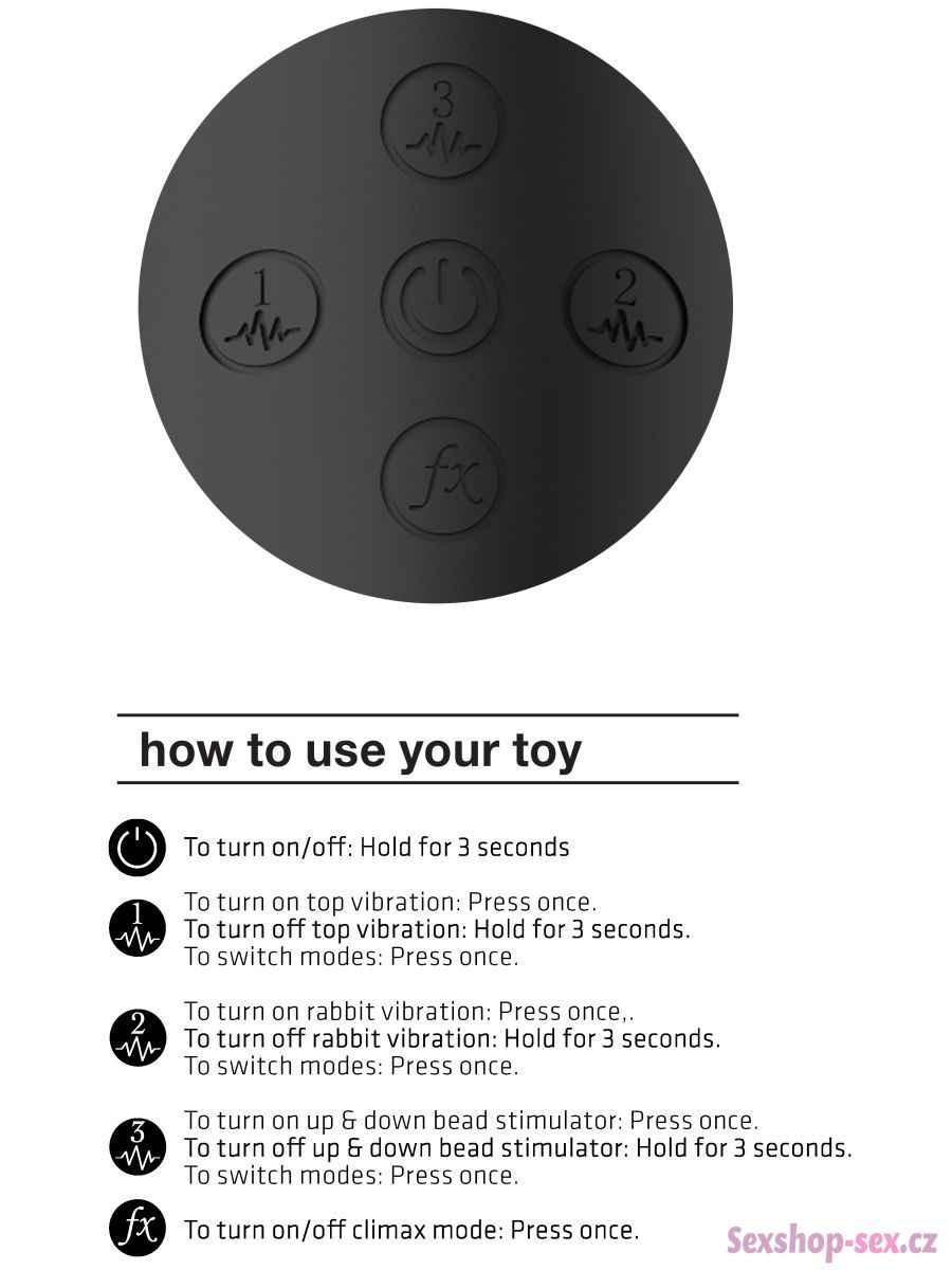 Vibrace v zasunutelné části a králíčku a stimulační kroužek ovládáte samostatnými tlačítky, takže si stimulaci přizpůsobíte momentální náladě a potřebám.