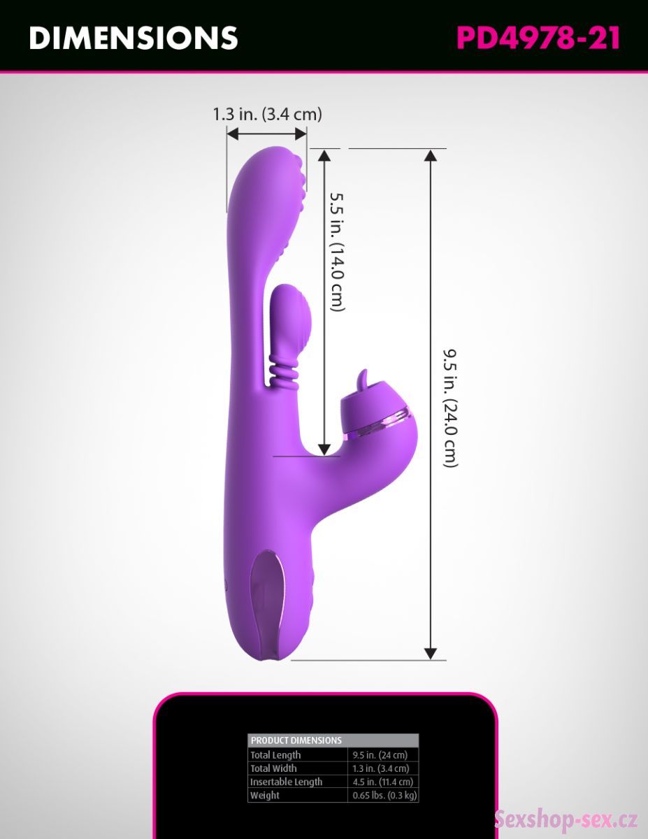 Má celkem 4 motorky, přičemž vibrace, masážní pohyb a králíčka můžete ovládat samostatnými tlačítky – namícháte si koktejl potěšení přesně podle chuti. U každé funkce si vyberete z 10 stimulačních módů.