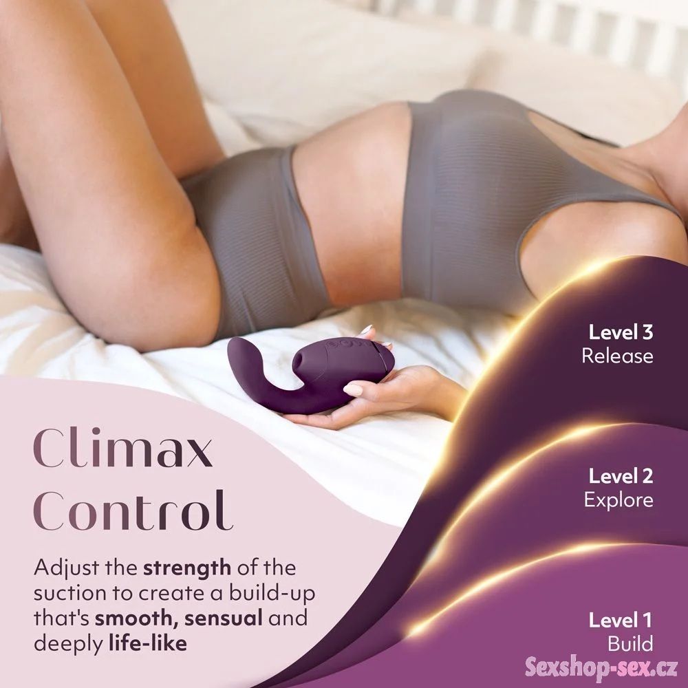Vibrátor provibruje pod G a klitoris potěší tlakovými vlnami a jemným sáním. Je tichý a má funkce Smart Silence, Afterglow a Climax Control: