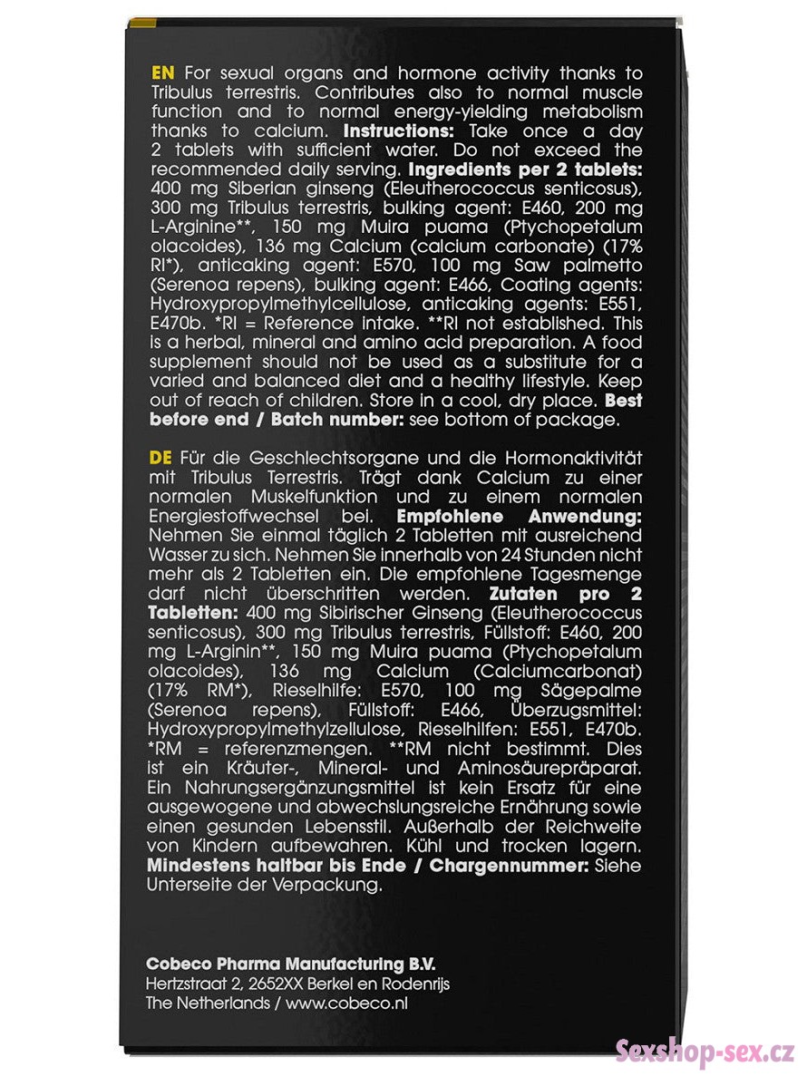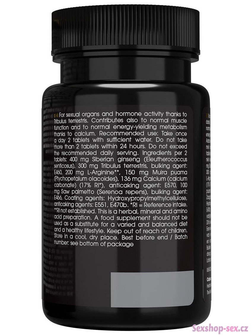 - Složení (ve 2 tabletách): 400 mg Siberian ginseng (Eleutherococcus senticosus); 210 mg Calcium (Calcium carbonate) (26%*); kypřicí látka: E460; 200 mg L-arginine; 150 mg Muira puama (Ptychopetalum olacoides); protispékavá látka: E570; 100 mg Saw Palmetto (Serenoa repens); 100 mg Tribulus terrestris, kypřicí látka: E466; potahové látky: Hydroxypropylmethylcellulose; protispékavé látky: E470b, E551